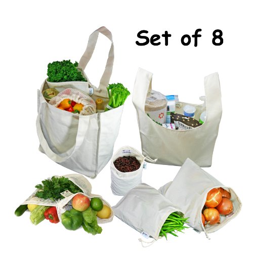 Simple Ecology , This set of 8 bags is everything needed for your typical trip to the market. The Deluxe Grocery Bag with Bottle Sleeves is perfect for the tall and heavy items. The Shopping Tote carries the lighter items. Six produce bags take care of the fruits, veggies and bulk foods, and double as storage bags at home. Long lasting, heavy-duty construction will allow you to save paper and plastic bags for many years. Don't be fooled by cheap polyester and synthetic reusable bags. They are actually made from oil and are NOT biodegradable. Our bags are made of UNBLEACHED ORGANIC COTTON. Although higher in cost, it provides huge benefits to the environment and our health by avoiding the highly toxic pesticides, fertilizers and processing chemicals used in regular cotton crops.